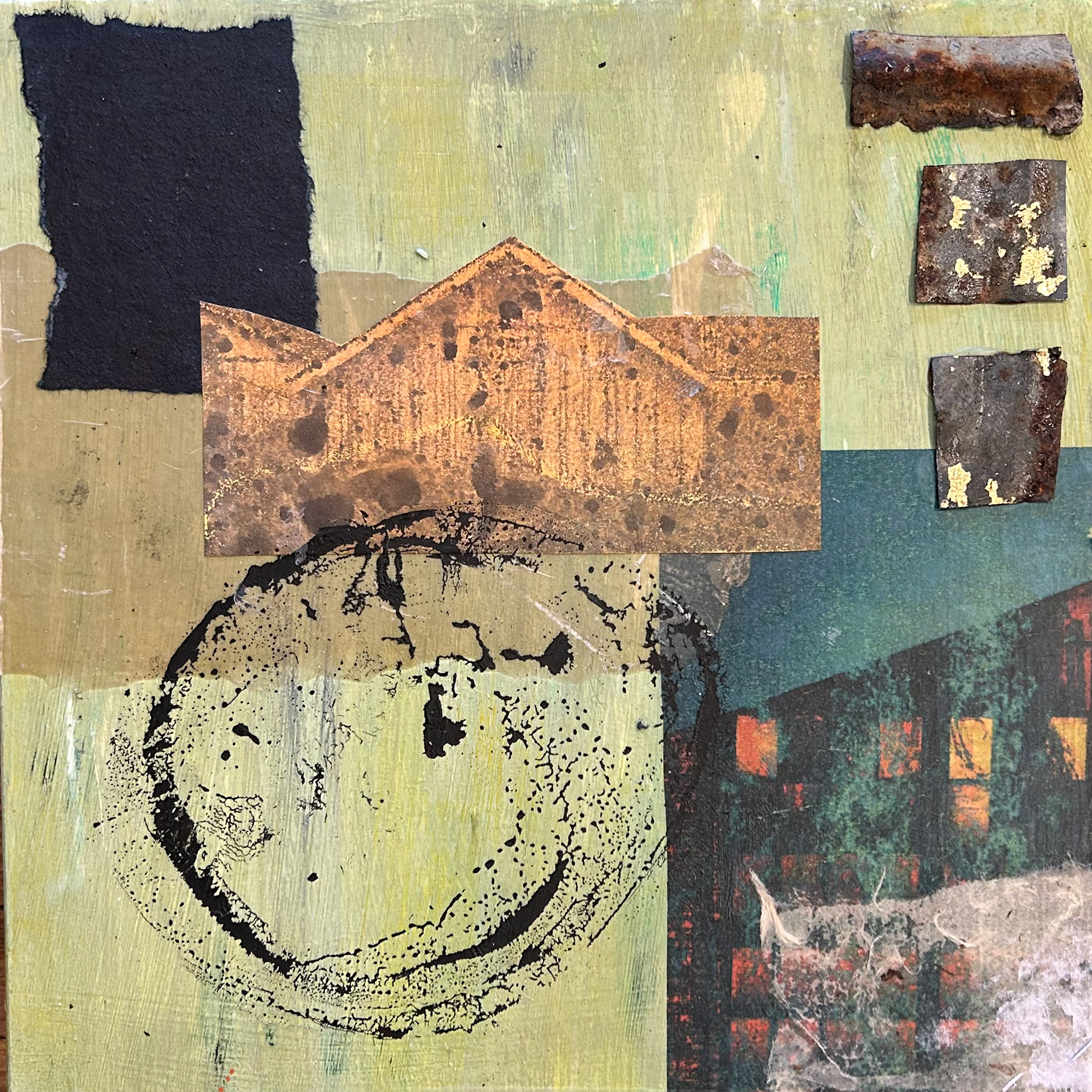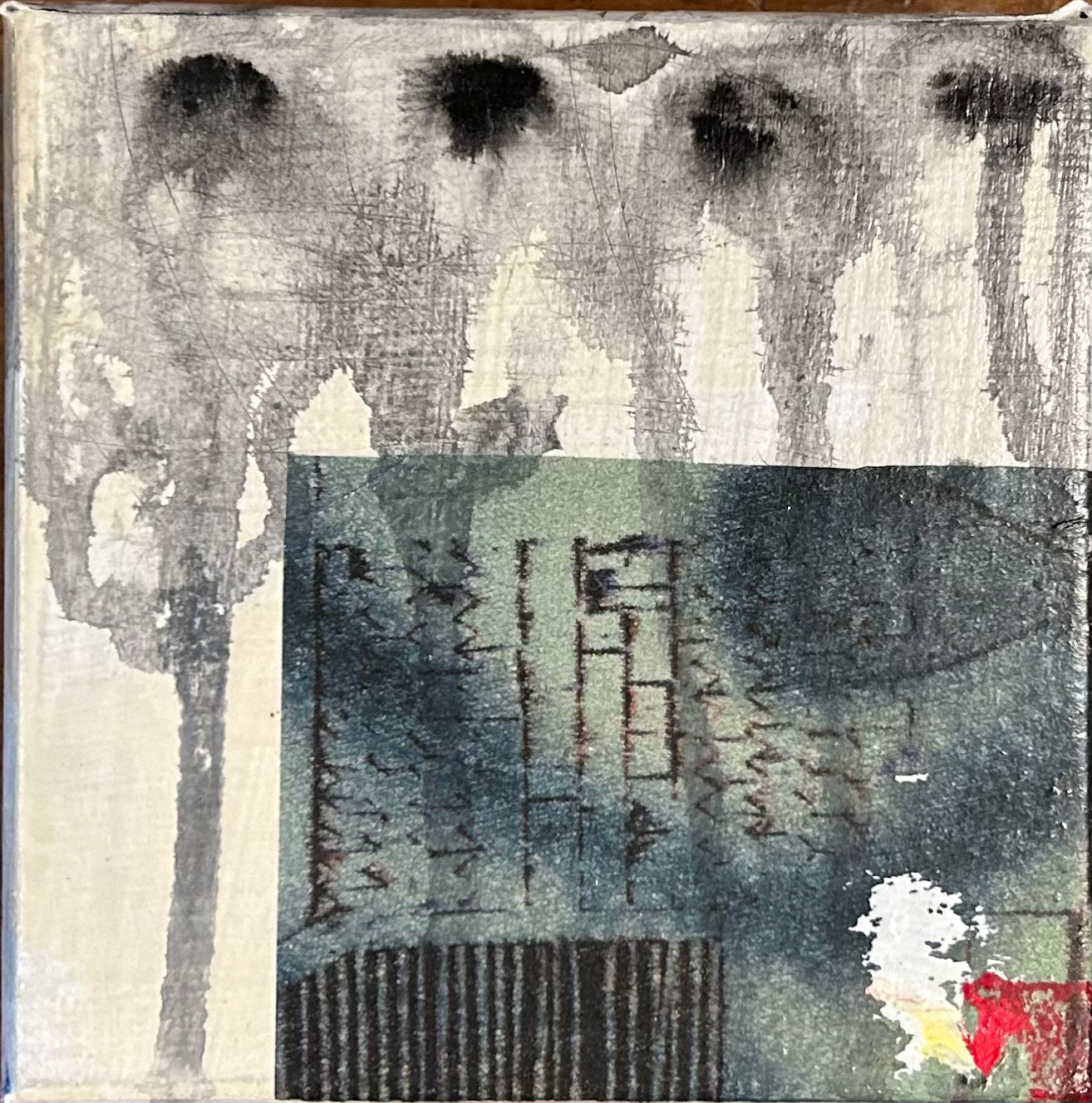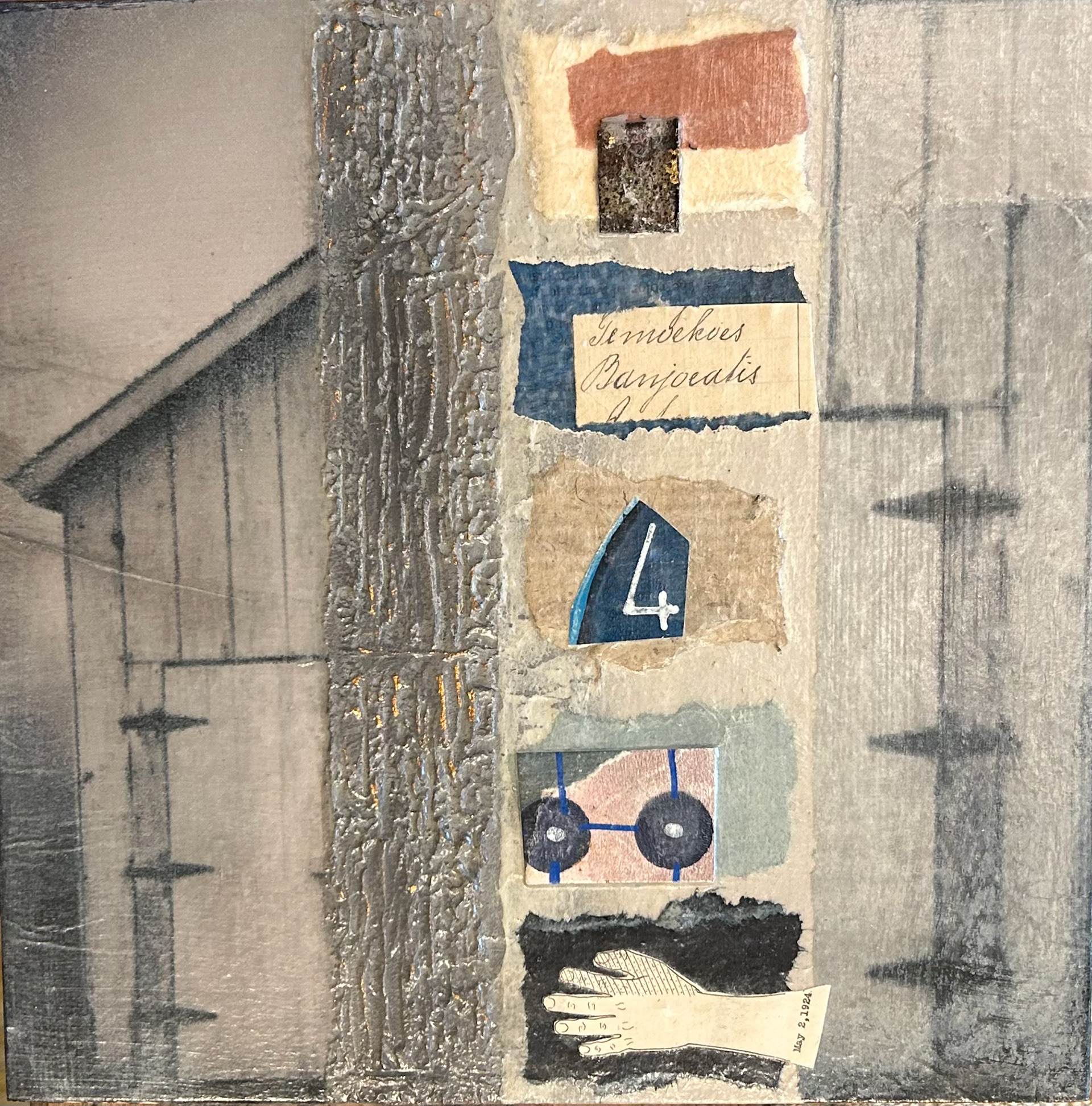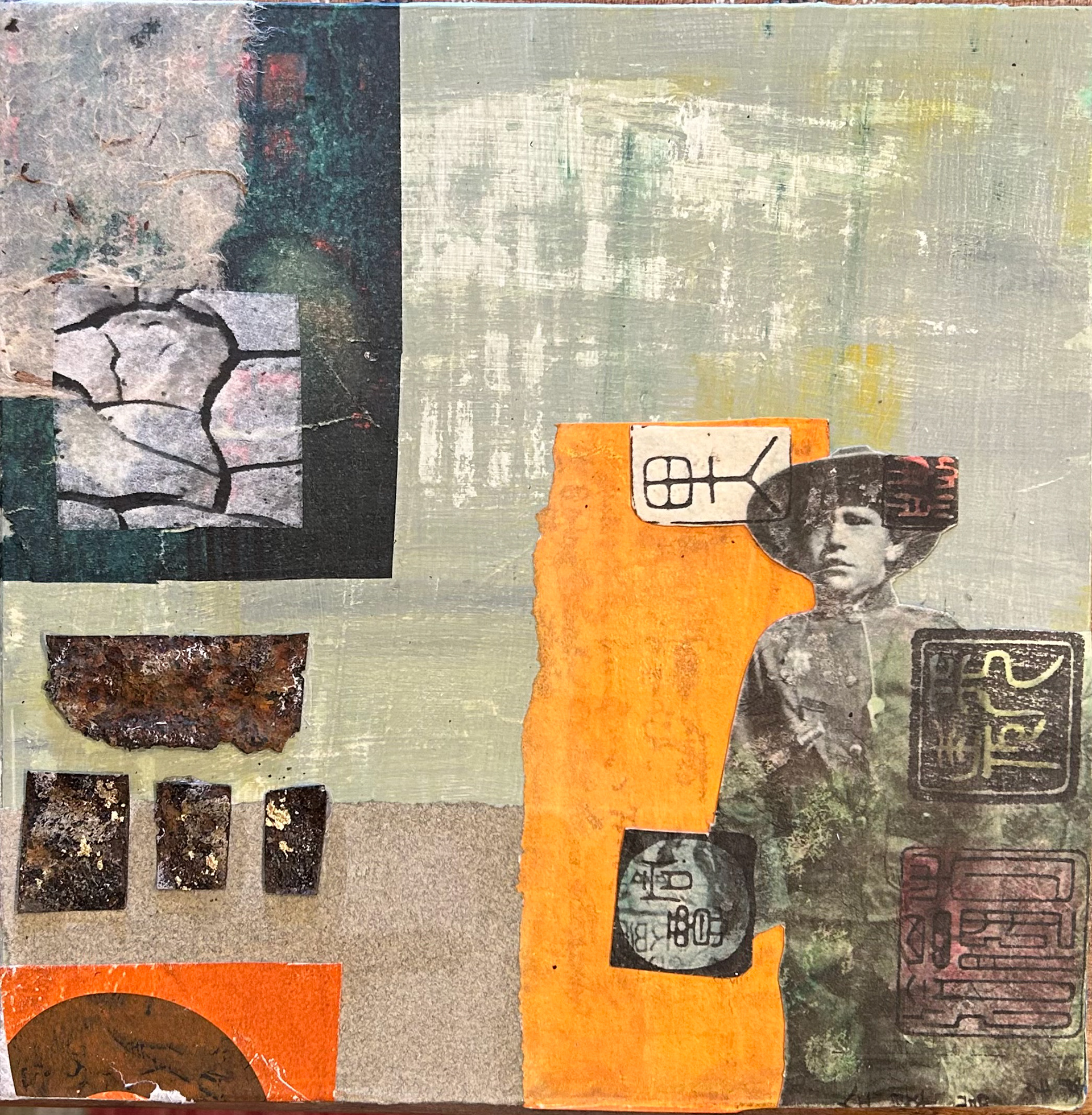 Photo based multimedia collage using acrylic paints, transferred photo images, ephemera on cradled board.