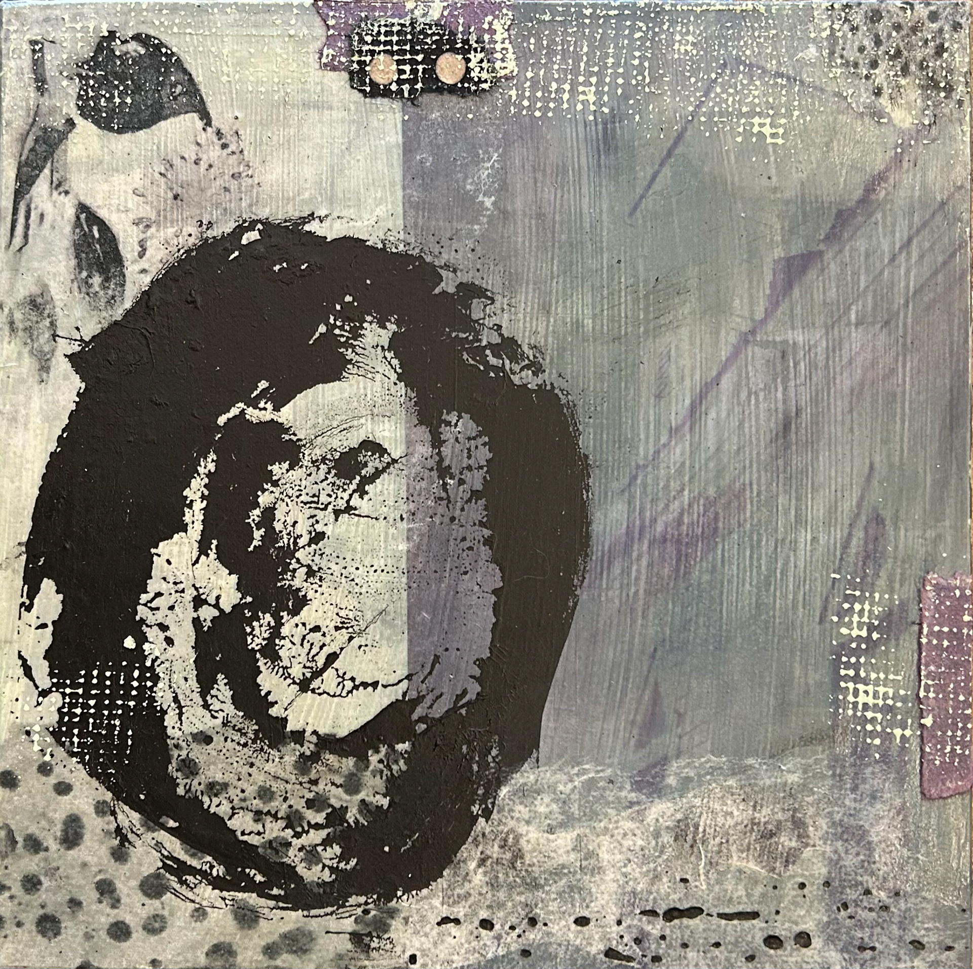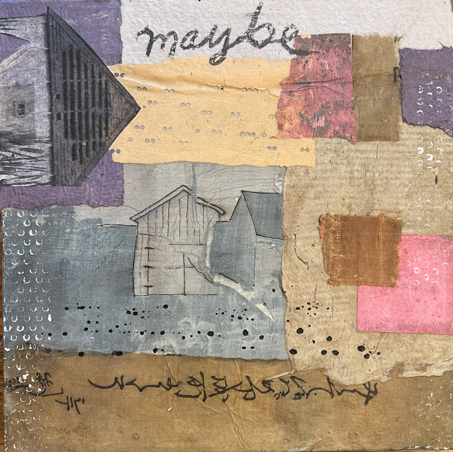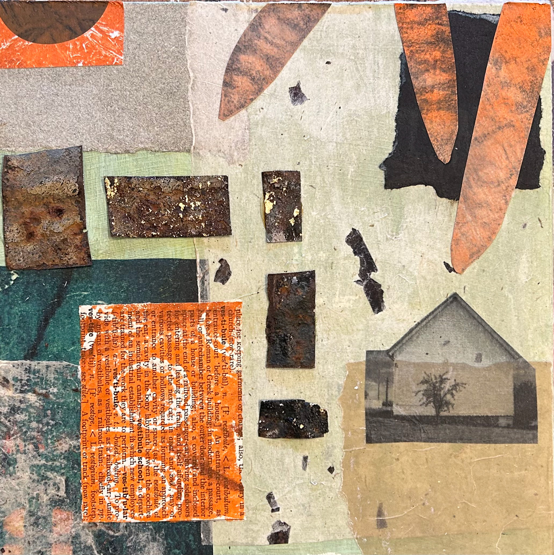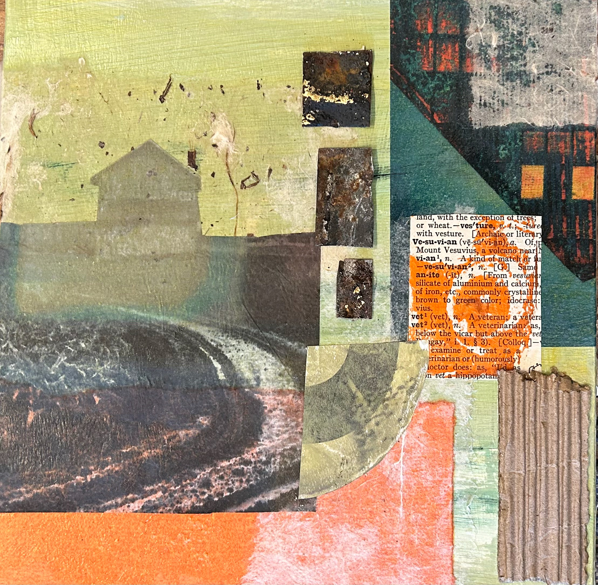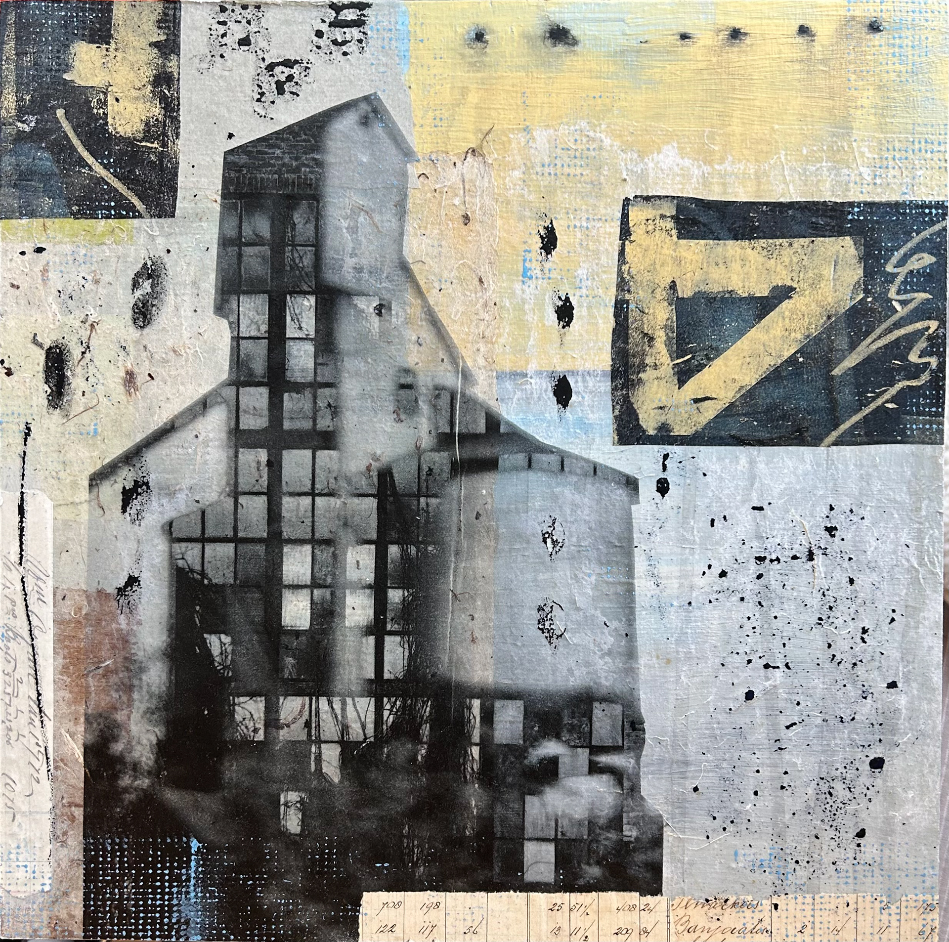Photo based multimedia collage using acrylic paints, transferred photo images, ephemera on cradled board.