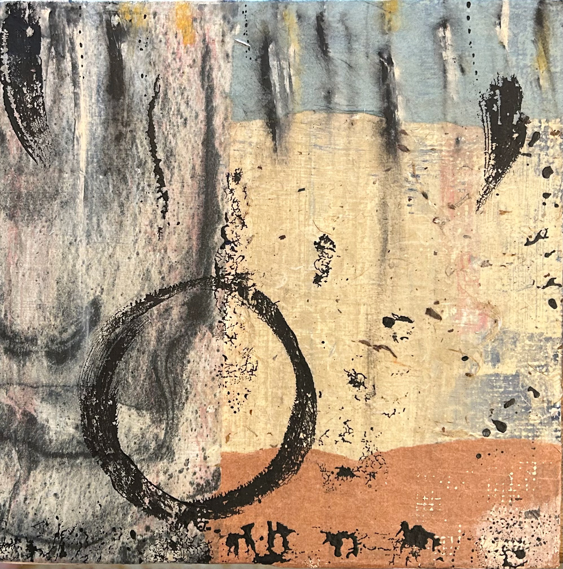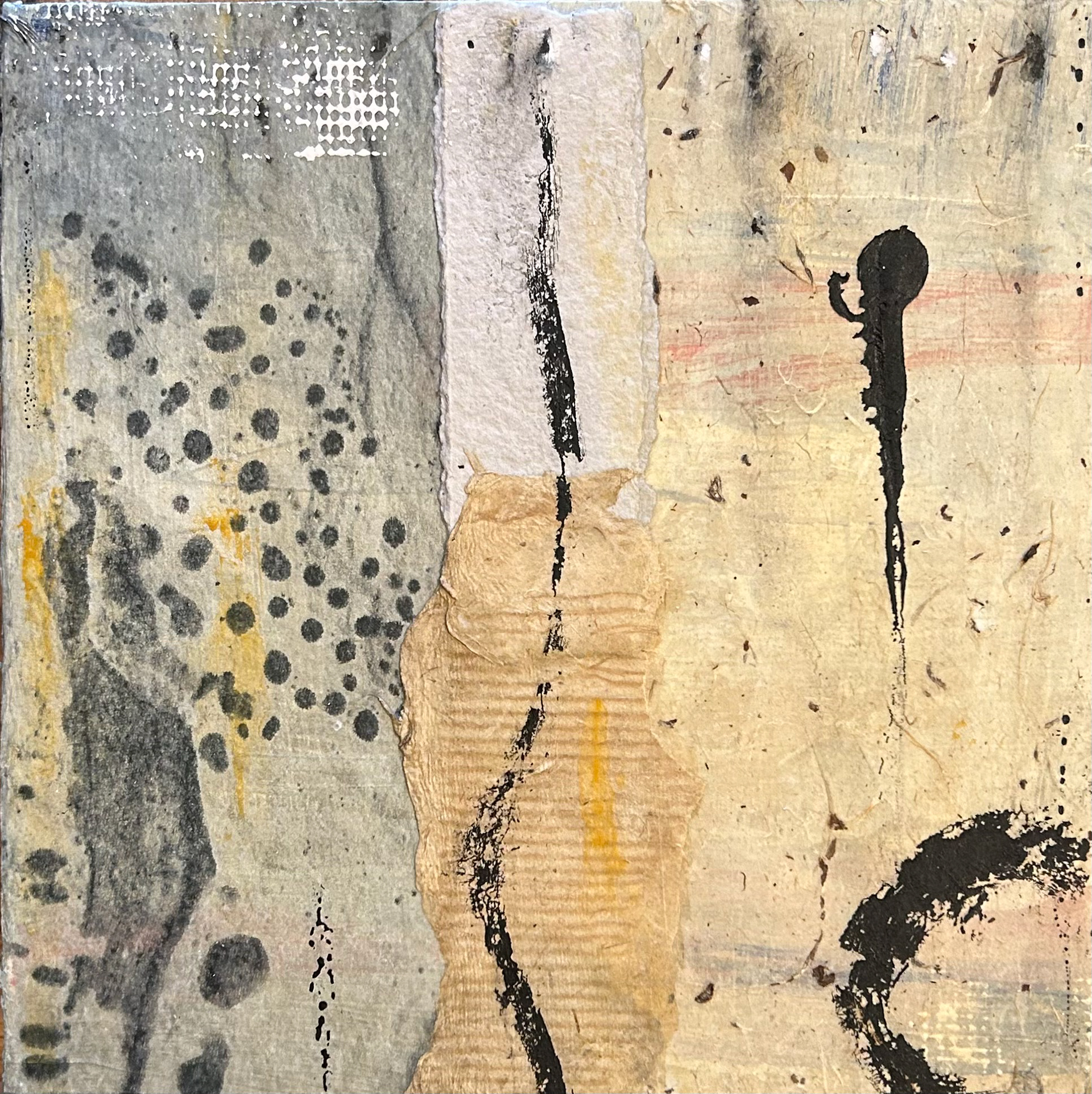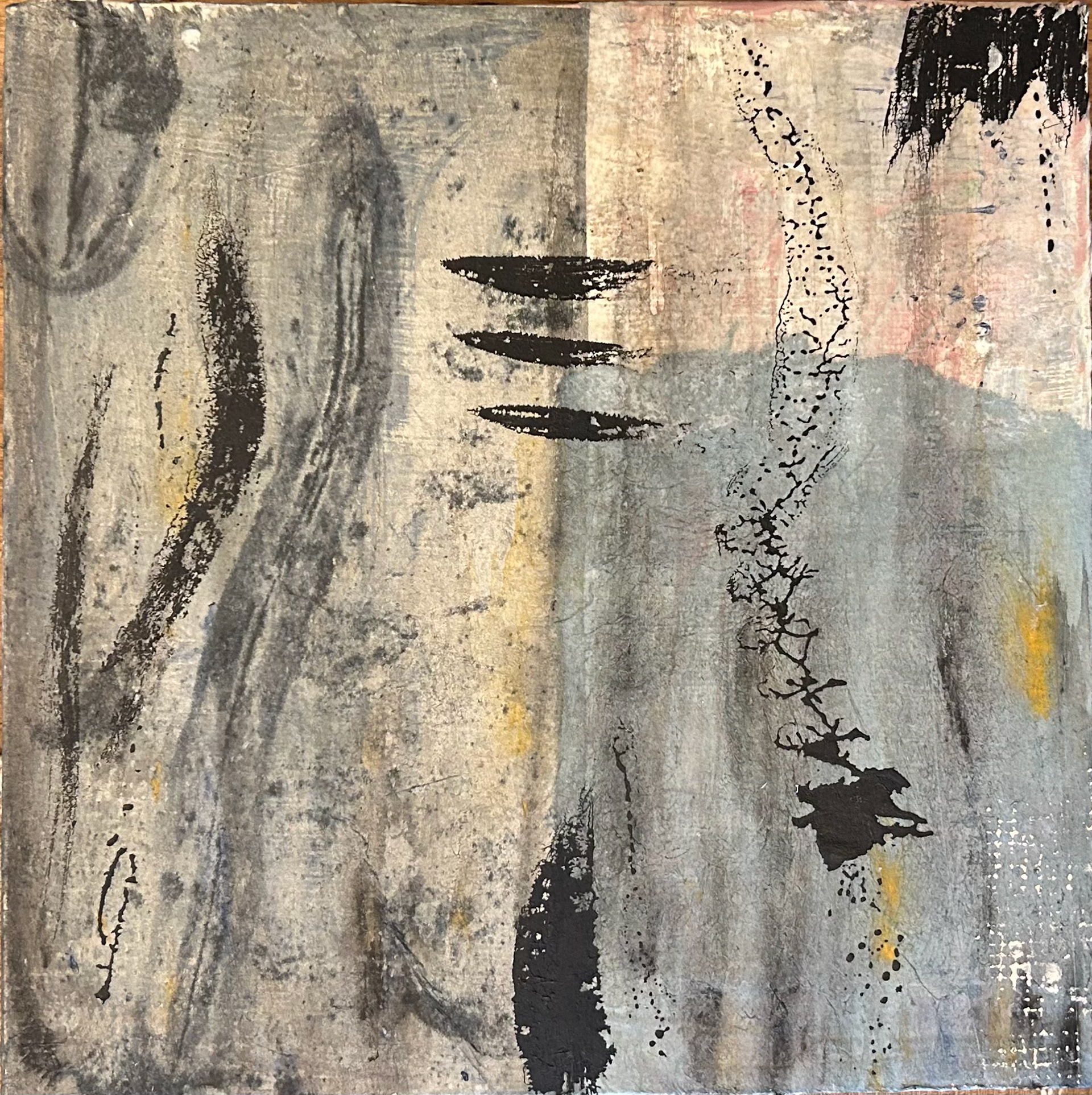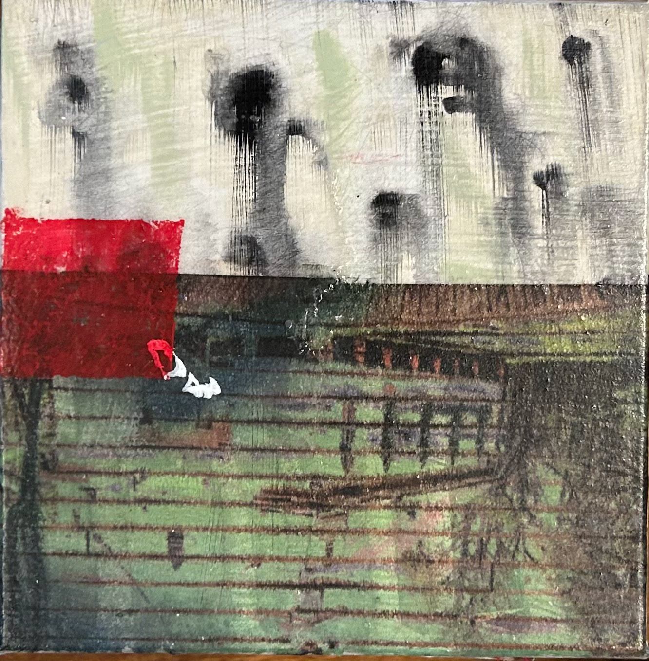 Photo based multimedia collage using acrylic paints, transferred photo images, ephemera on cradled board.
